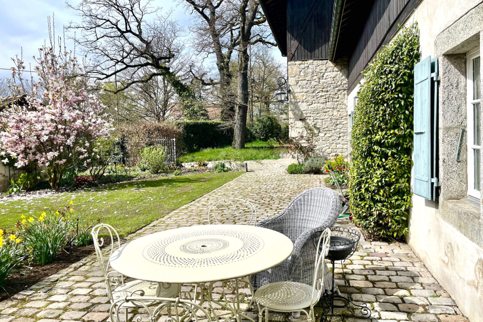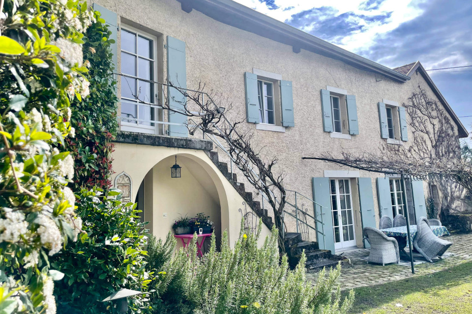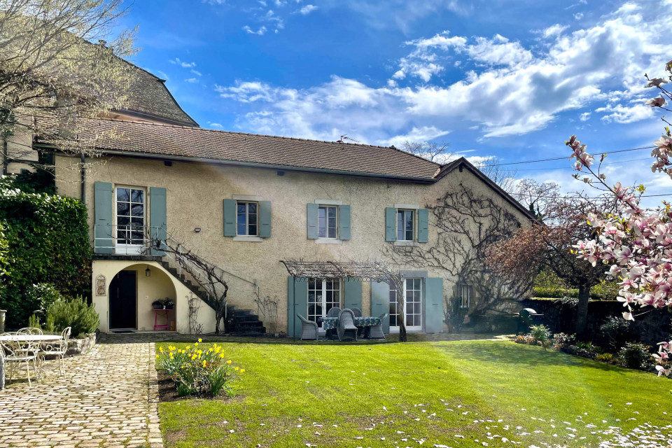 Originally belonging to a notable family of the Geneva bourgeoisie, the property of almost 4,395 sqm offers a main house of 350 sqm and an outbuilding of 300 sqm. The garden is well wooded and has a beautiful flowering according to the season. An old dovecote is used for garden equipment. Beautifully maintained, the main residence is dating from the 17th century. It has an entrance hall which lead to a laundry room, a guest toilet, onto to the kitchen dining room an then to the living room with fireplace and exposed beams, all extended by beautiful terraces. An independent studio with ensuite bathroom, and a technical room are located on the same floor. The upper level hosts a second living room with beautiful exposed beams, a master bedroom with en suite bathroom and three bedrooms plus a bathroom.