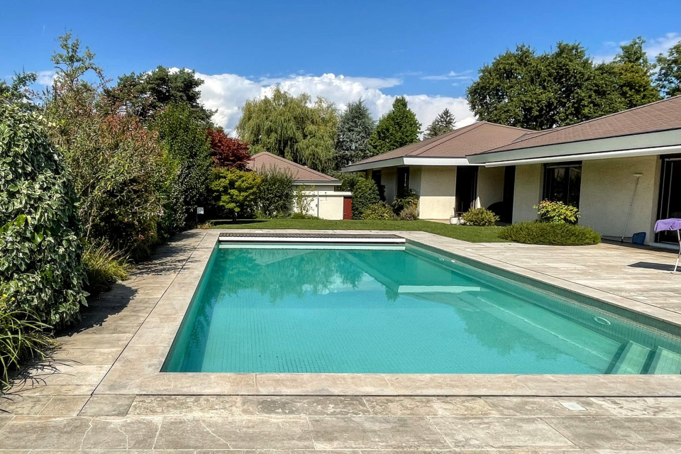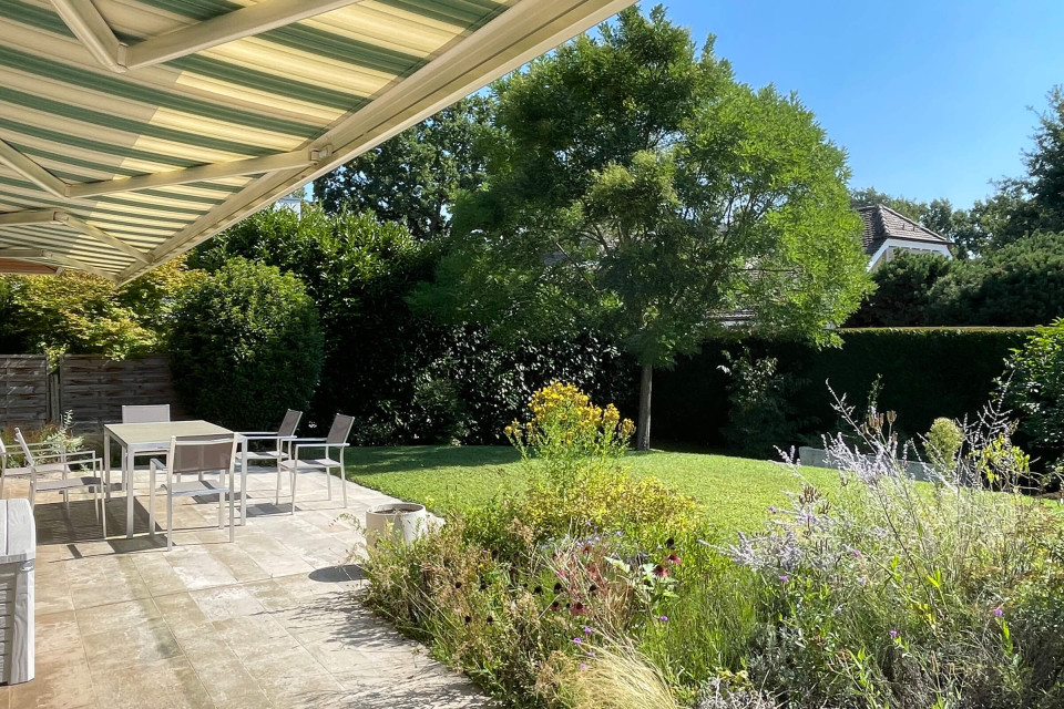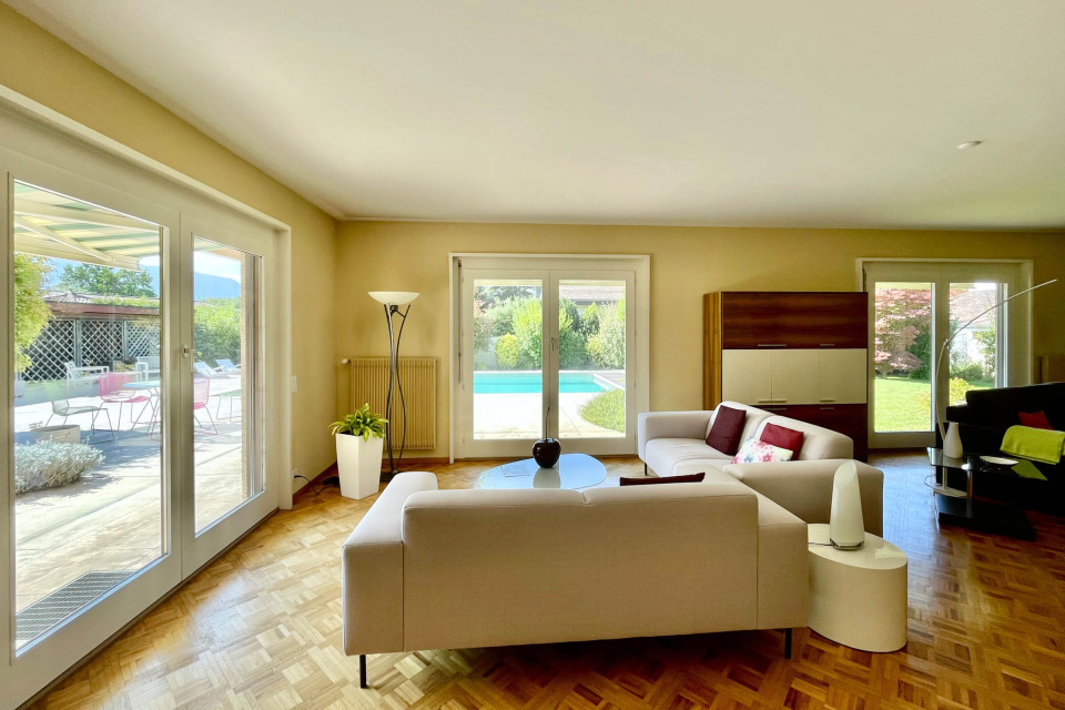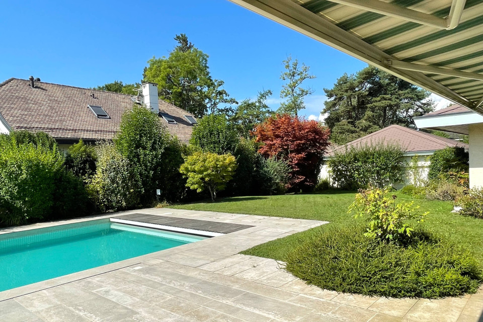 Agréable villa indépendante de plain-pied datant de la fin des années 70, d’environ 450 m2 au total, implantée sur une belle parcelle de 1398 m2 avec une magnifique piscine extérieure, dans un quartier très calme et résidentiel, proche de toutes les commodités et des écoles internationales à 10 mins du centre-ville de Genève.