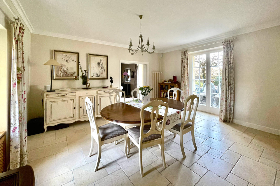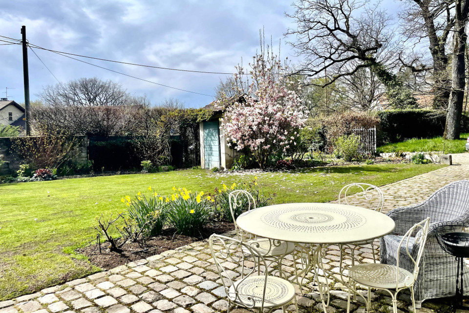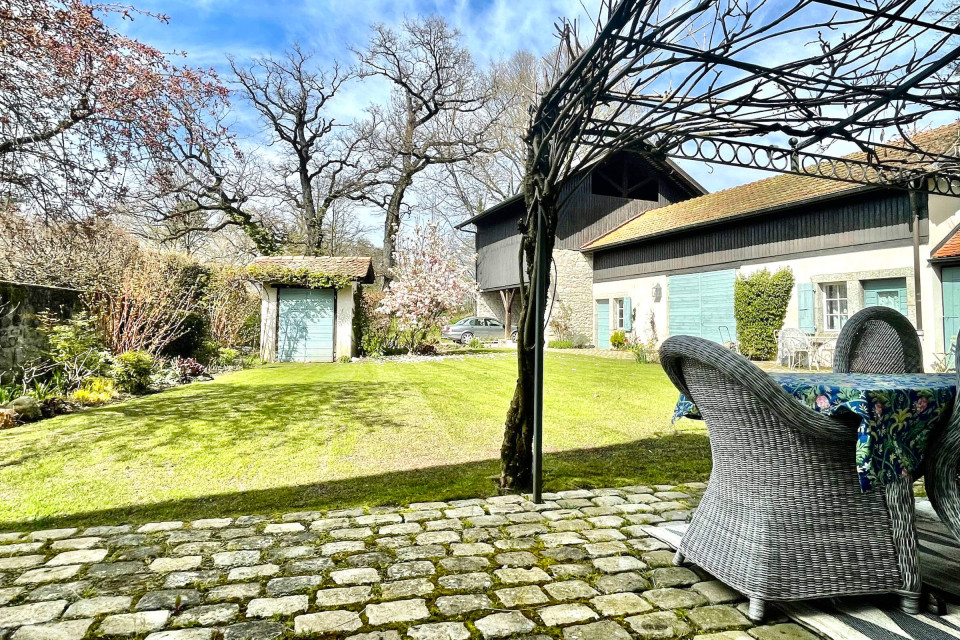 Originally belonging to a notable family of the Geneva bourgeoisie, the property of almost 4,395 sqm offers a main house of 350 sqm and an outbuilding of 300 sqm. The garden is well wooded and has a beautiful flowering according to the season. An old dovecote is used for garden equipment. Beautifully maintained, the main residence is dating from the 17th century. It has an entrance hall which lead to a laundry room, a guest toilet, onto to the kitchen dining room an then to the living room with fireplace and exposed beams, all extended by beautiful terraces. An independent studio with ensuite bathroom, and a technical room are located on the same floor. The upper level hosts a second living room with beautiful exposed beams, a master bedroom with en suite bathroom and three bedrooms plus a bathroom.